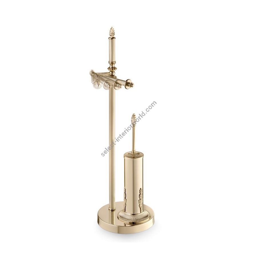 SMERALDO The bathroom floor stand is an exquisite blend of premium materials and sophisticated design, perfect for high-end bathrooms. Crafted with brass plated in gold, it adds a touch of luxury and refinement to the environment. The swiveling toilet paper holder, carefully placed in the stand, offers an elegant practicality. The toilet brush, also in golden brass, seamlessly integrates into the set, further accentuating the prestige of the bathroom. This piece of furniture not only meets functional needs but transforms the bathroom into a space of refined beauty and comfort, ideal for those seeking a high-quality experience.