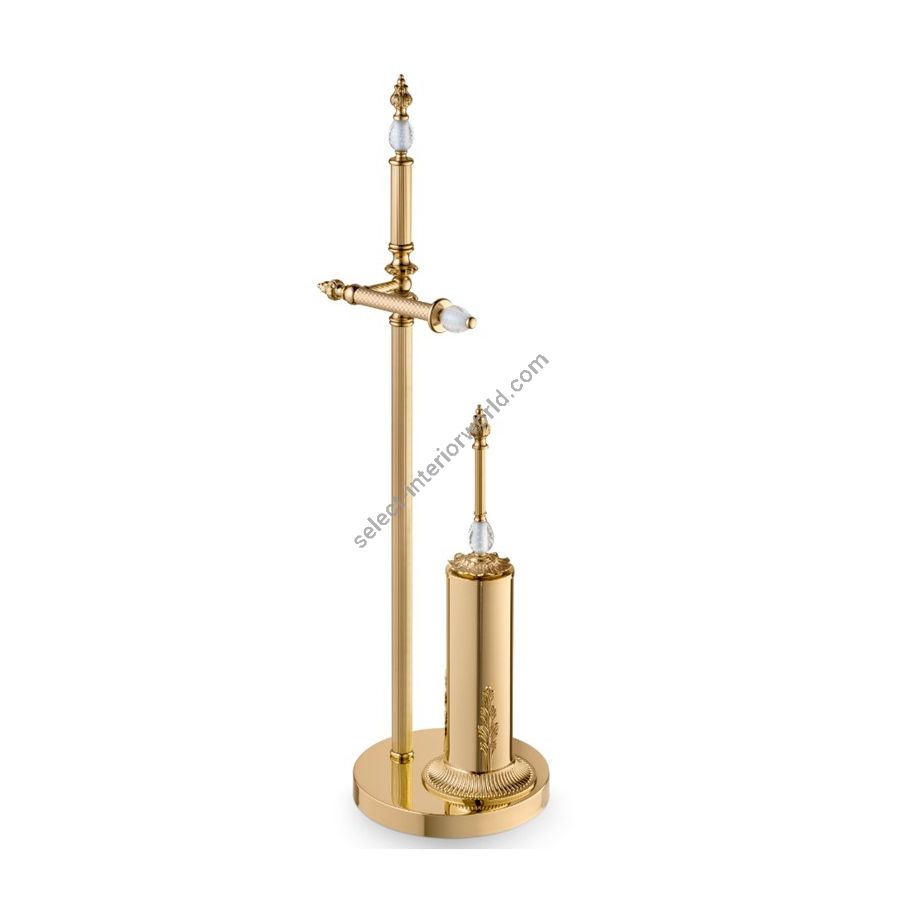 GEMMA The bathroom floor stand is an exquisite blend of premium materials and sophisticated design, perfect for high-end bathrooms. Crafted with brass plated in gold, it adds a touch of luxury and refinement to the environment. The swiveling toilet paper holder, carefully placed in the stand, offers an elegant practicality. The toilet brush, also in golden brass, seamlessly integrates into the set, further accentuating the prestige of the bathroom. This piece of furniture not only meets functional needs but transforms the bathroom into a space of refined beauty and comfort, ideal for those seeking a high-quality experience.