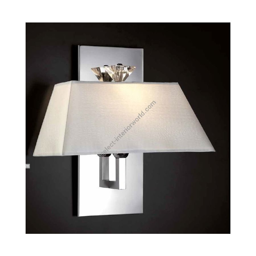 Wall lamp in brass with crystal element and fabrics lampshade. Lighting item that diffuses the light with great effect in the surrounding environement creating a warm and welcoming atmosphere.