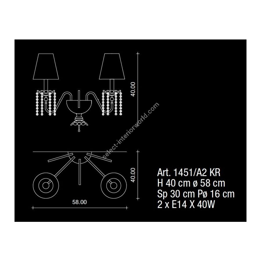 Bulbs: 2 x E14 X 40W| Dimensions (HxWxD): | cm: 40x58x30 / inch: 15.75"x22.83"x11.81" |
