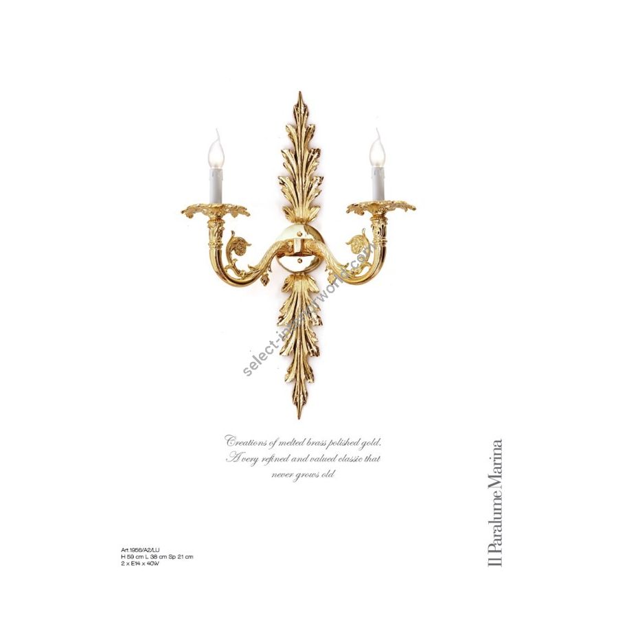 2 lights wall lamp in cast brass. Lighting item that diffuses the light with great effect in the surrounding environement creating a warm and welcoming atmosphere.