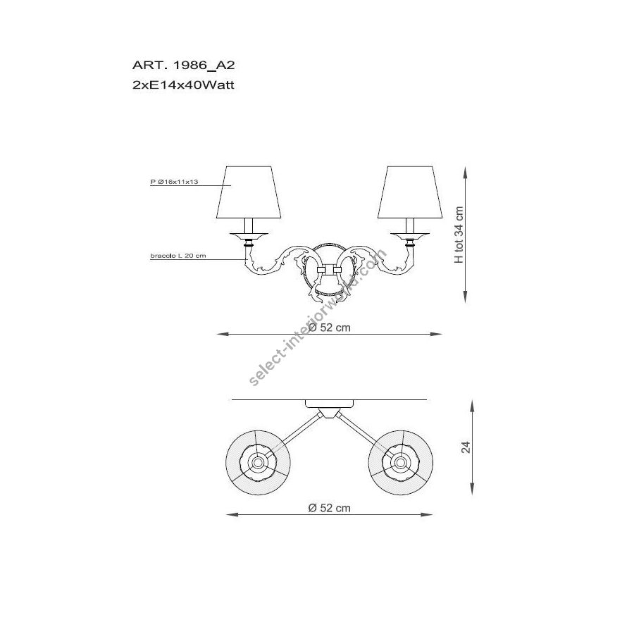 Bulbs: 2XE14xled| Dimensions (HxWxD): | cm: 34x52x24 / inch: 13.39"x20.47"x9.45" |