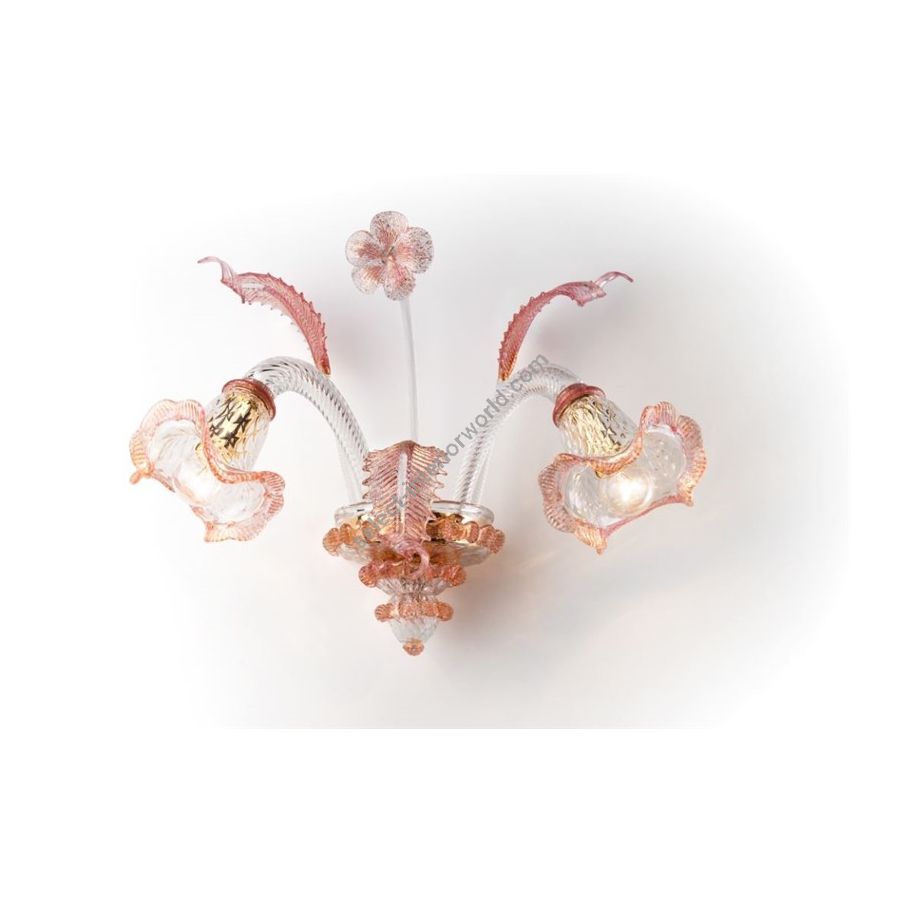 Murano glass wall lamp transparent with decoration in pink color. Lighting item that diffuses the light with great effect in the surrounding environement creating a warm and welcoming atmosphere.