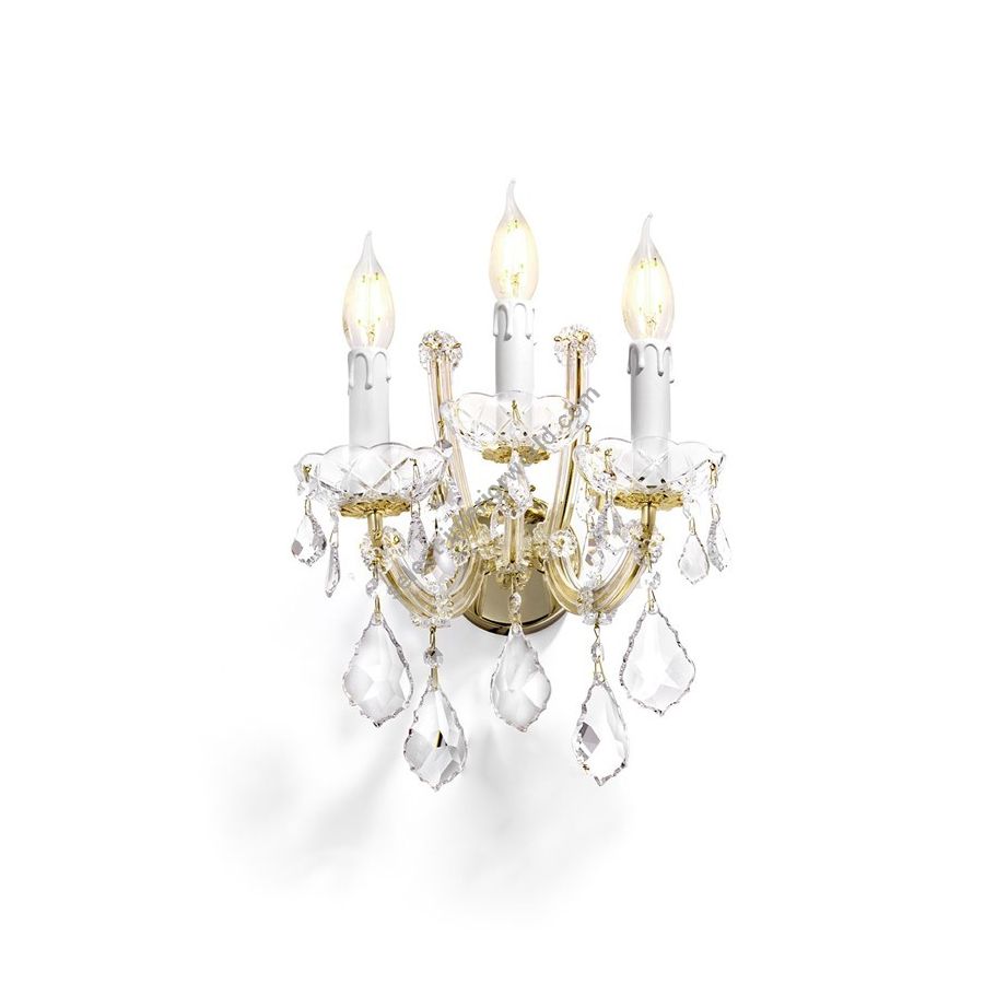 Mariateresa wall lamp with soft gold metal frame covered by transparent glass arms and transparent Asfour® Crystal pendants. Lighting item that diffuses the light with great effect in the surrounding environement creating a warm and welcoming atmosphere.
