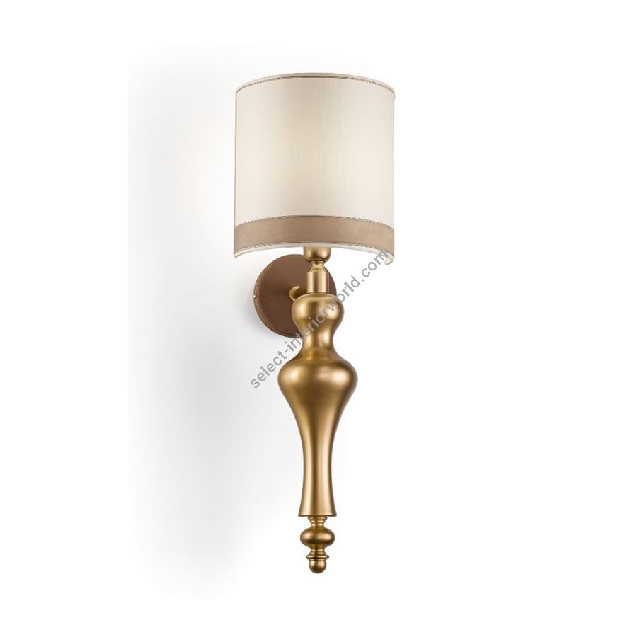 Elegant and refined wall lamp with a matte gold metal structure, enriched with eco-leather details that add warmth and sophistication. The ivory fabric lampshade diffuses a soft and enveloping light, ideal for creating cozy and elegant atmospheres. Perfect for bedrooms, corridors, and living rooms, it combines classical elegance with contemporary style.