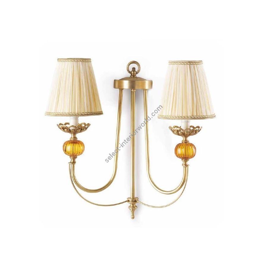 Wall lamp 2 lights in brass with inserts of amber Murano glass and fabric lampshades. Lighting item that diffuses the light with great effect in the surrounding environement creating a warm and welcoming atmosphere.