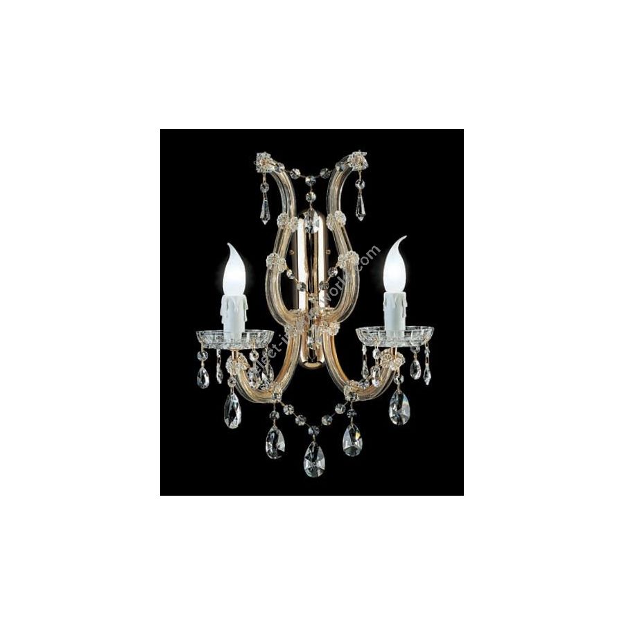 Mariateresa Wall Sconce with Gold plated metal frame covered by transparent glass arms and transparent Crystal pendants. Lighting item that diffuses the light with great effect in the surrounding environement creating a warm and welcoming atmosphere.