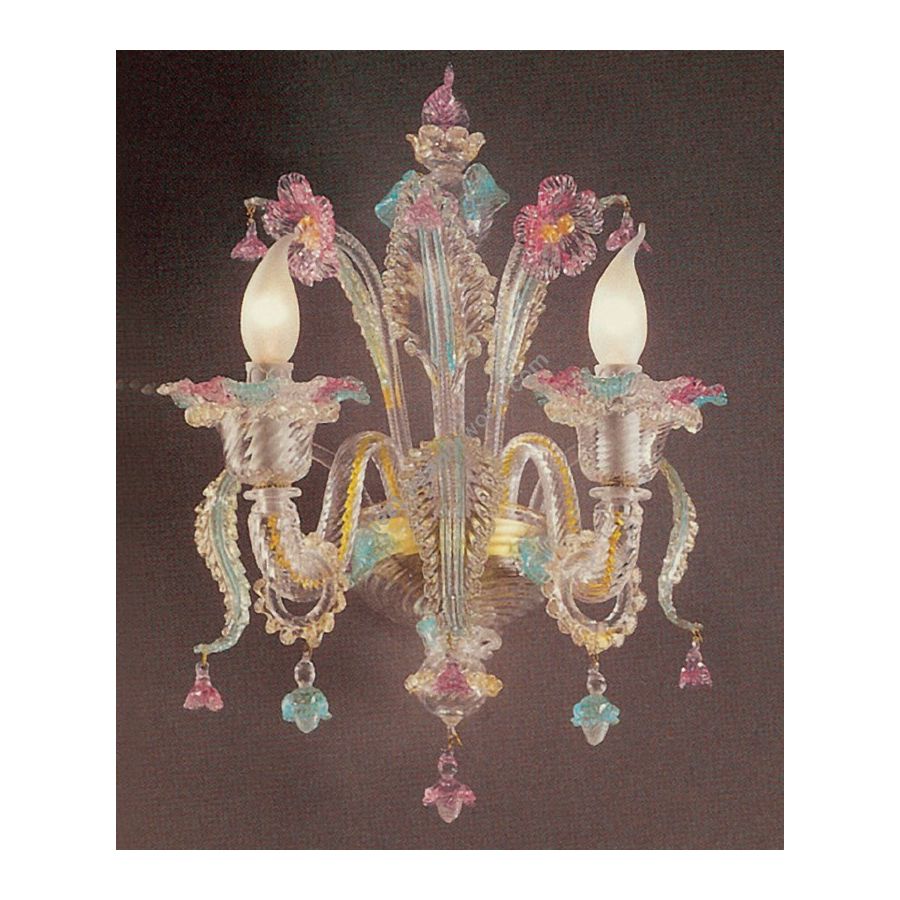 Transparent 2-light wall light with gold, blue and pink decoration. Lighting fixture that diffuses the light into the surrounding environment with great effect, creating a warm and welcoming atmosphere.