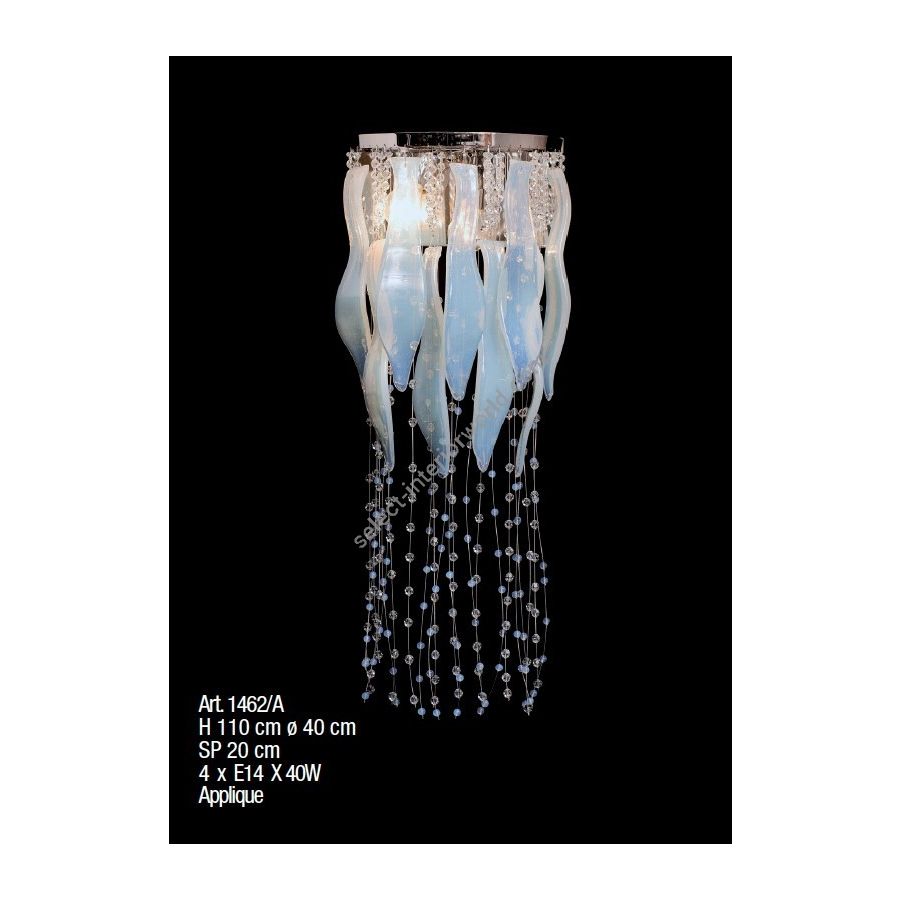 Chrome wall light with mother-of-pearl Murano glass leaves and Swarovski® pearls. Lighting fixture that diffuses the light into the surrounding environment with great effect, creating a warm and welcoming atmosphere.