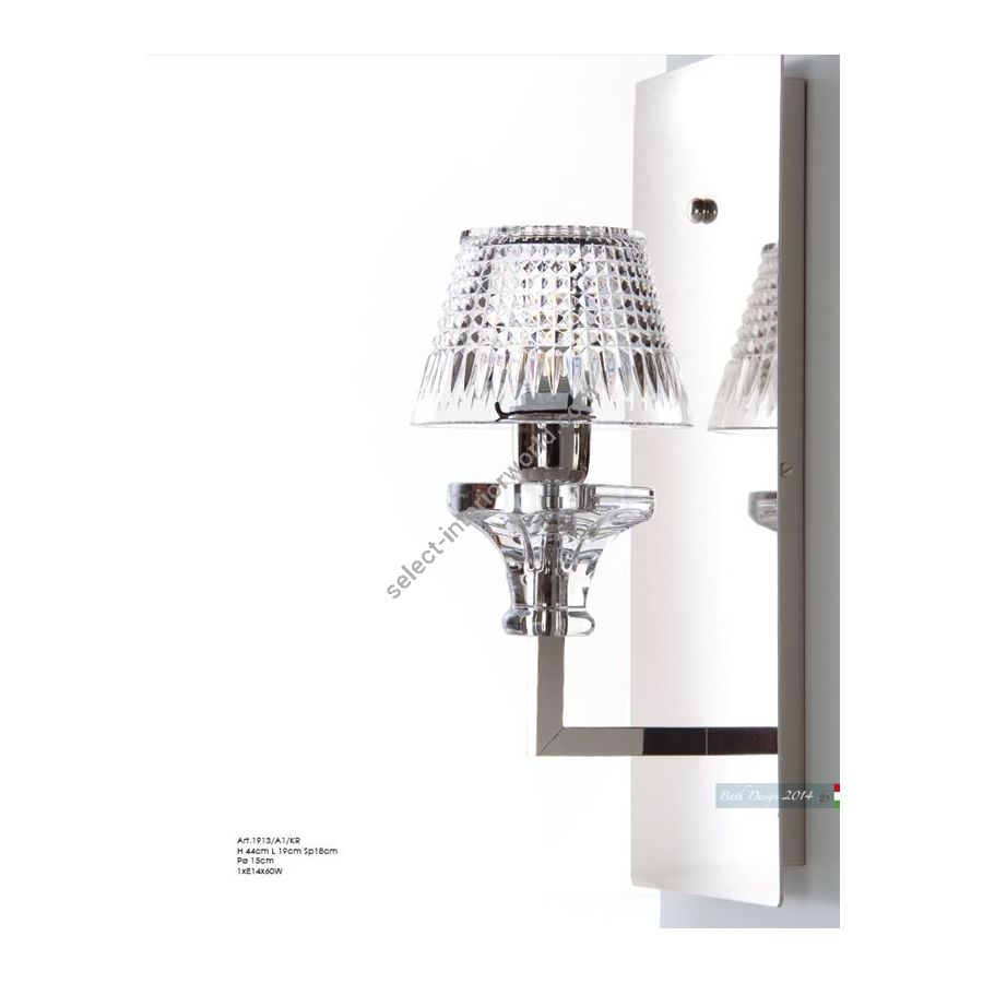 Wall lamp with crystal lampshade. Lighting item that diffuses the light with great effect in the surrounding environement creating a warm and welcoming atmosphere.