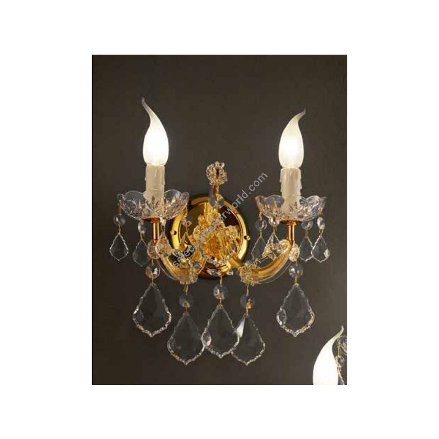 Mariateresa Wall Sconce with Gold plated metal frame covered by transparent glass arms and transparent Crystal pendants. Lighting item that diffuses the light with great effect in the surrounding environement creating a warm and welcoming atmosphere.