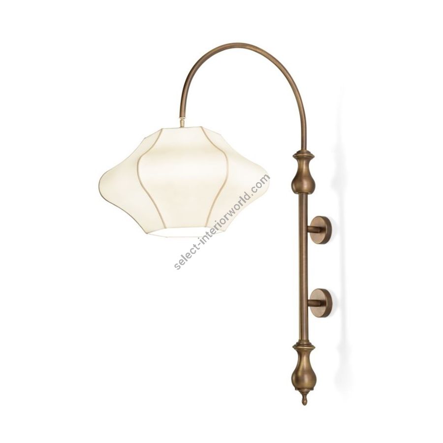 Elegant wall lamp with a hand-brushed burnished metal structure, featuring a curved arm that supports a refined lampshade in double ivory silk fabric. The light is soft and enveloping, perfect for creating a cozy and sophisticated atmosphere. Ideal for corridors, reading areas, or living spaces, it combines craftsmanship and classic-contemporary style with a touch of exclusive refinement.