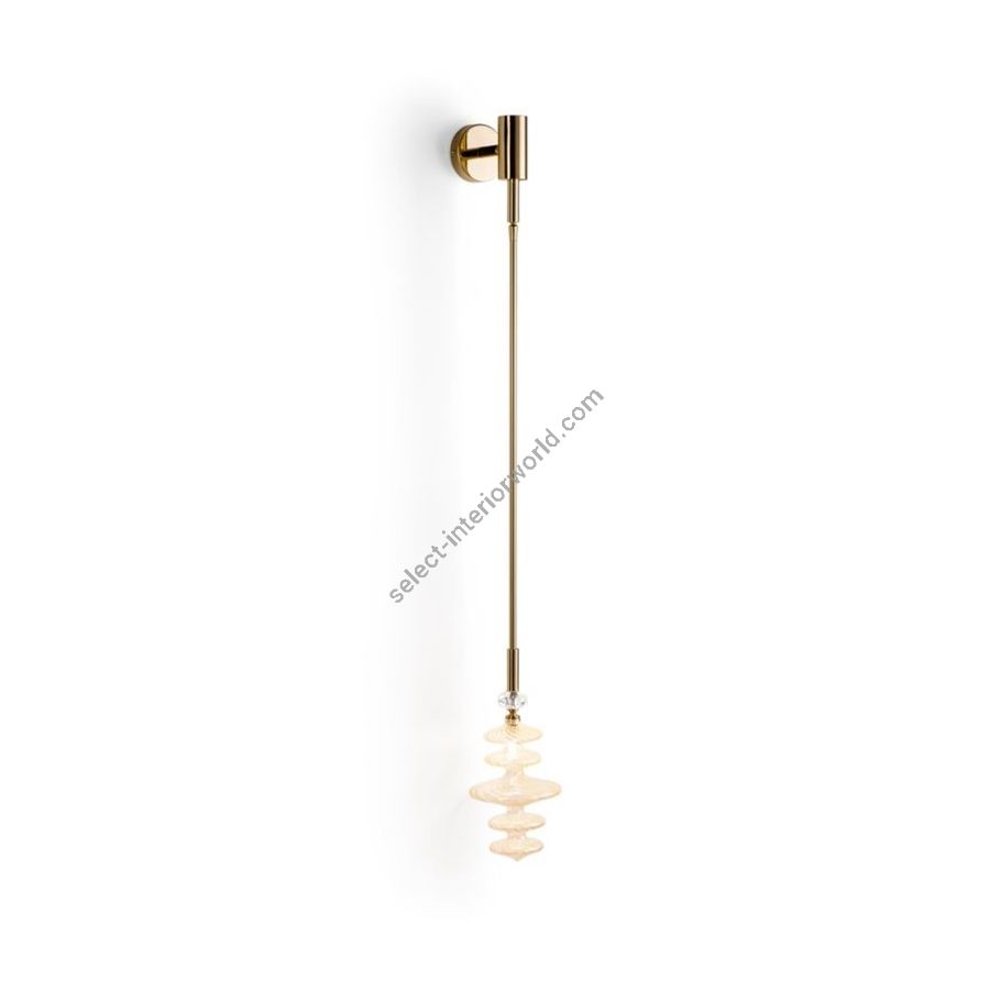 Vinea – Glass and Metal Wall Sconce Vinea is a refined and sculptural wall sconce featuring a metal structure with a 24K gold finish, highlighting its sleek and contemporary silhouette. The design is completed by a clear glass element with delicate gold accents, housing a G9 bulb inside that creates a play of reflections and a soft, warm glow. With a height of 120 cm (˜ 47.2”), Vinea stands out for its elegant proportions and can be custom-made in different heights upon request. Available in 110V for the U.S. market, with a JBOX-compatible base. Other metal finishes available upon request.