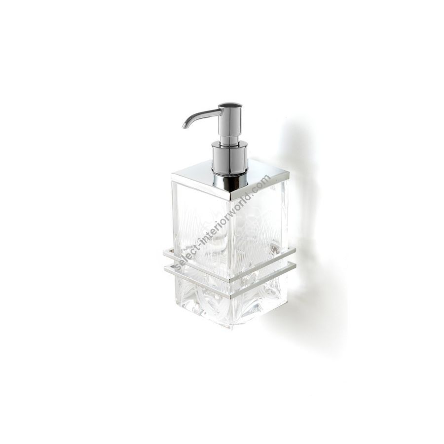Italian Crystal soap dispenser wall with hand-engraved peafowl plume figure. Functional elements that create an extremely elegant, welcoming and high-value bathroom.