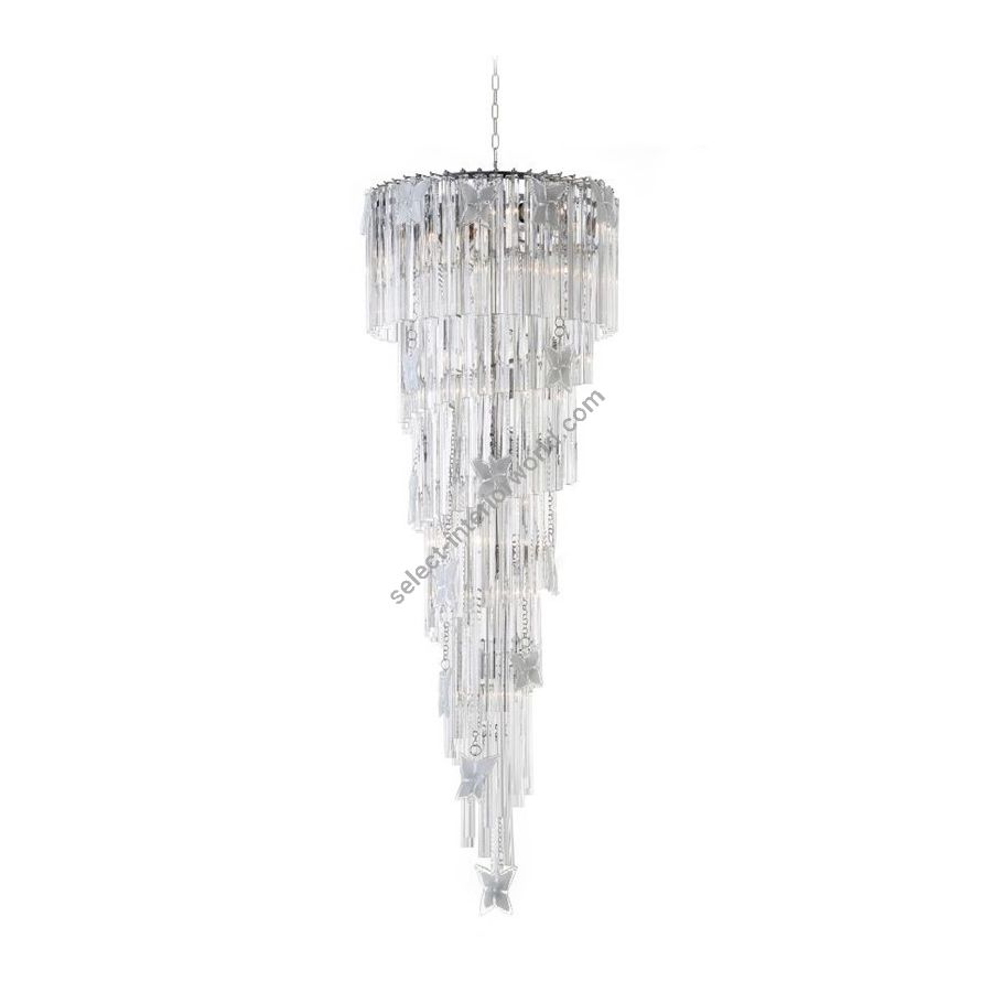 Chandelier with transparent triedri and white and trasparent butterfly all Murano glass. Lighting item that diffuses the light with great effect in the surrounding environement creating a warm and welcoming atmosphere.