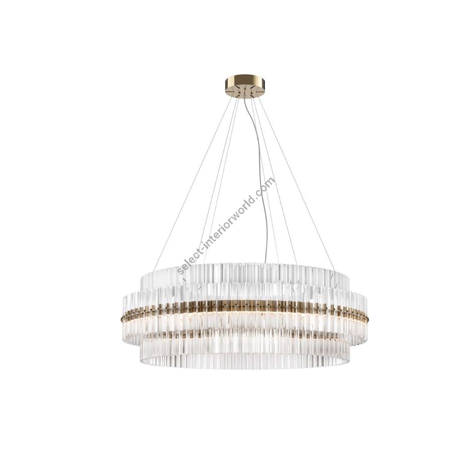 Round chandelier with double Triedro Glass. Lighting item that diffuses the light with great effect in the surrounding environement creating a warm and welcoming atmosphere.