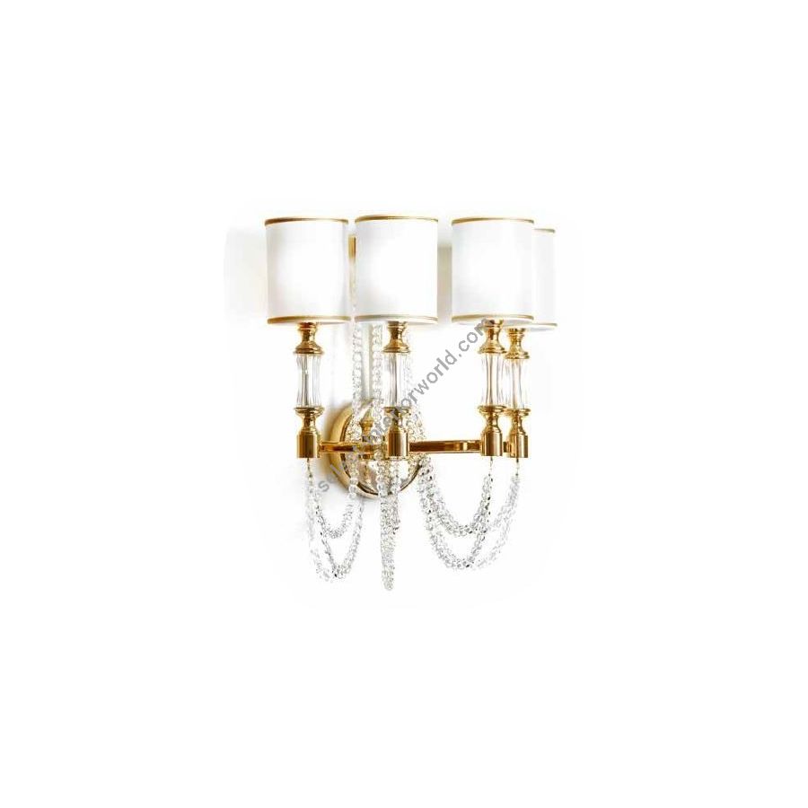 Wall Lamp in brass with rows of crystal pearls. Lampshades in white shiny organza on pvc with gold thread trimming. Lighting item that diffuses the light with great effect in the surrounding environement creating a warm and welcoming atmosphere.