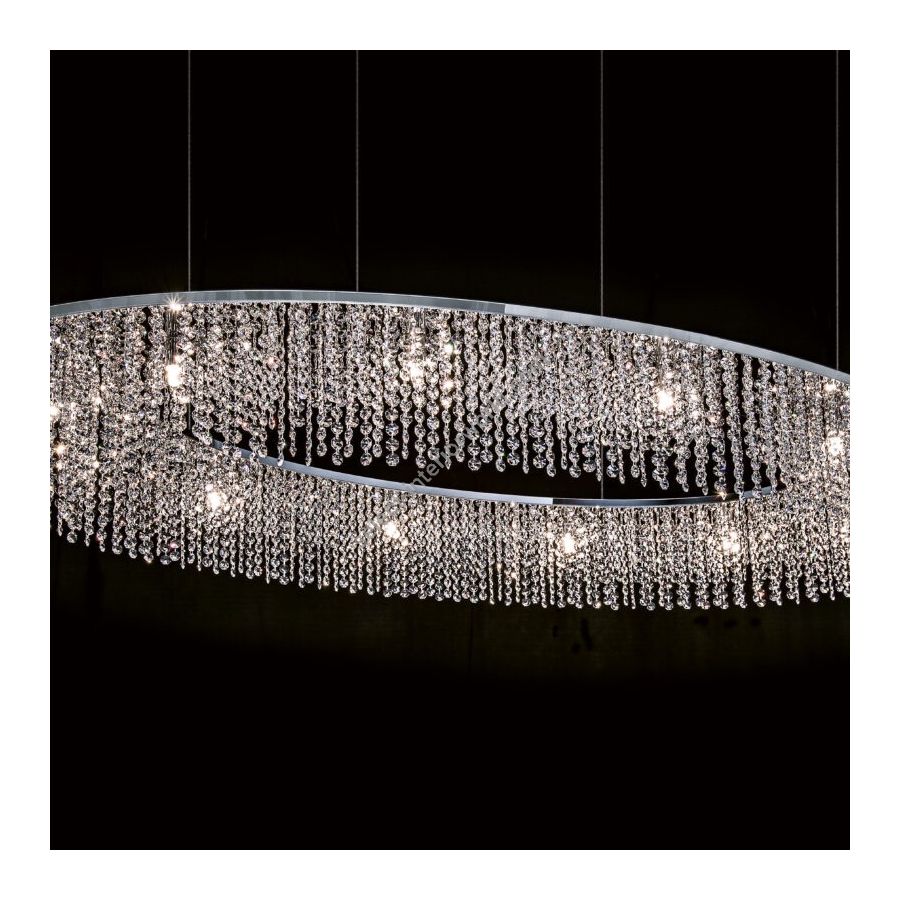 Sky Cycles is a striking, yet sophisticated lighting fixture. The design consists mainly of high-end crystals, which are carefully positioned in such a manner that it will not become overpowering. It is a very minimalistic luminary, with a very calm and chic appearance. In addition, the fixture is very versatile, due to its many possibilities in design. It can be displayed in various ways, for it is a beautiful design to be displayed in a dining area, as well as an eye-catching detail for the entrance of a residence.