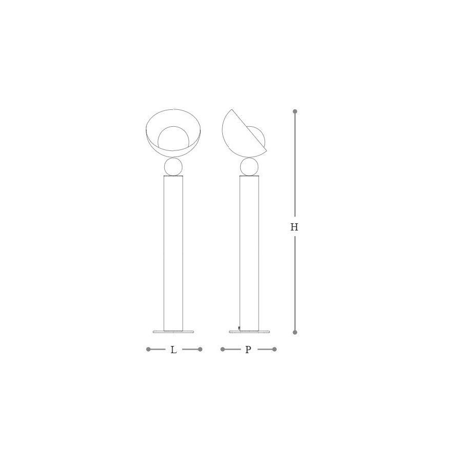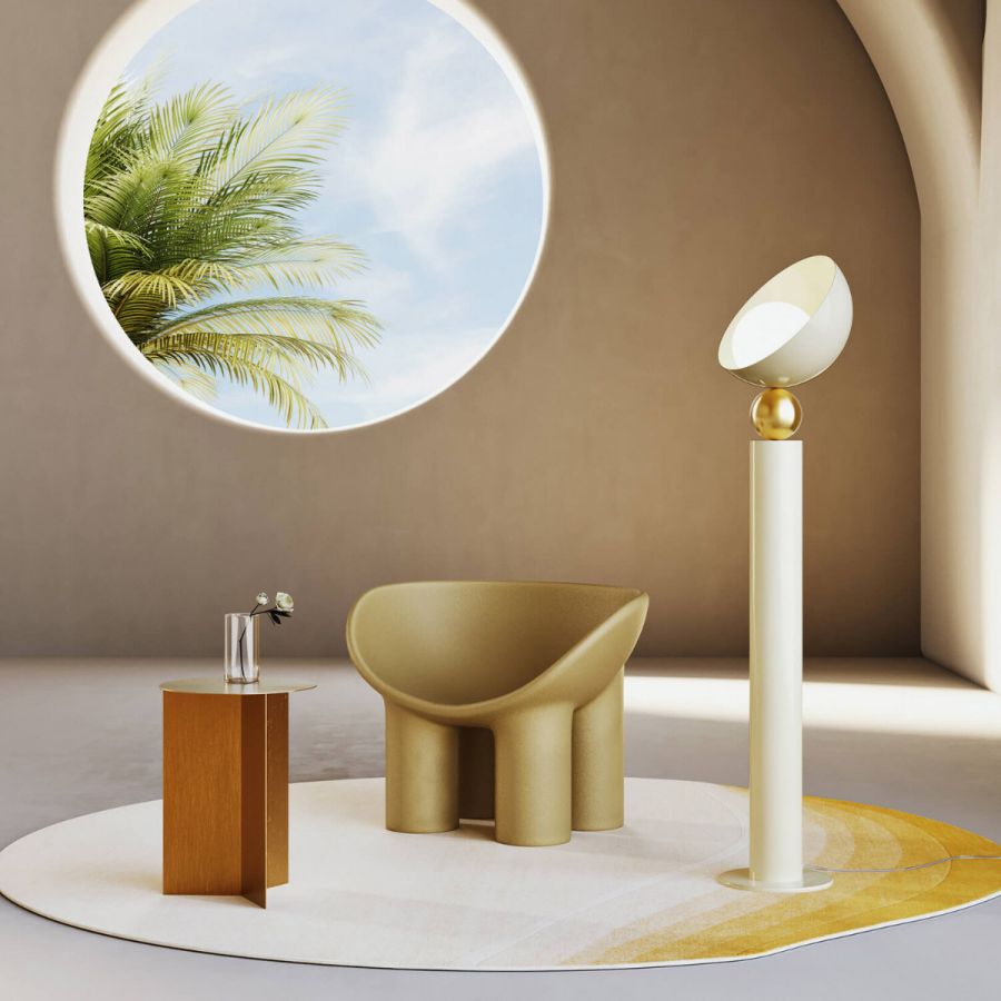 Aurora is a floor lamp with structure and decorative parts in metal available in Ancient White, Yellow Sunrise, Baby Blue, Baby Pink and Cappuccino. Middle sphere with brushed light gold finish. Diffuser in white glass.