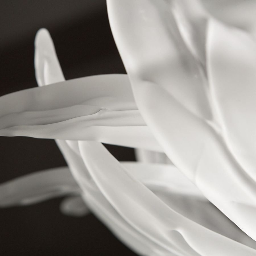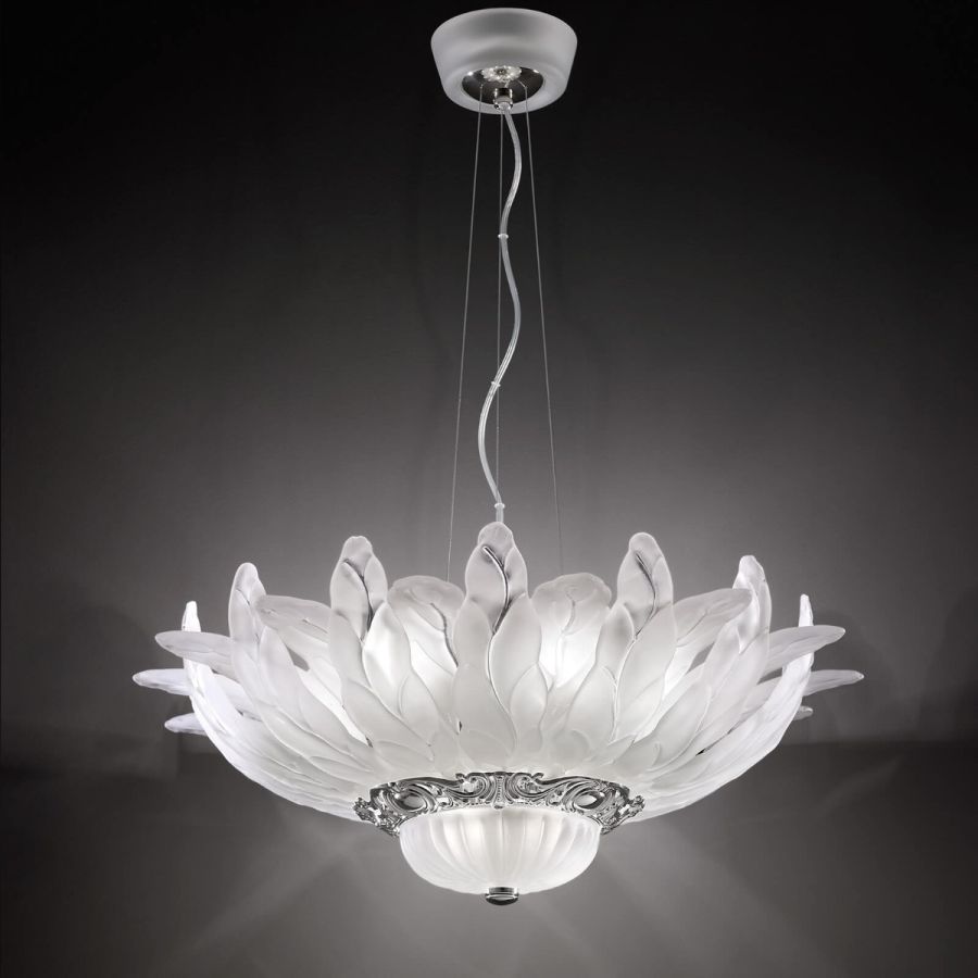 Pendant lamp with satin glass leaves and decorative metal details with nickel finish.