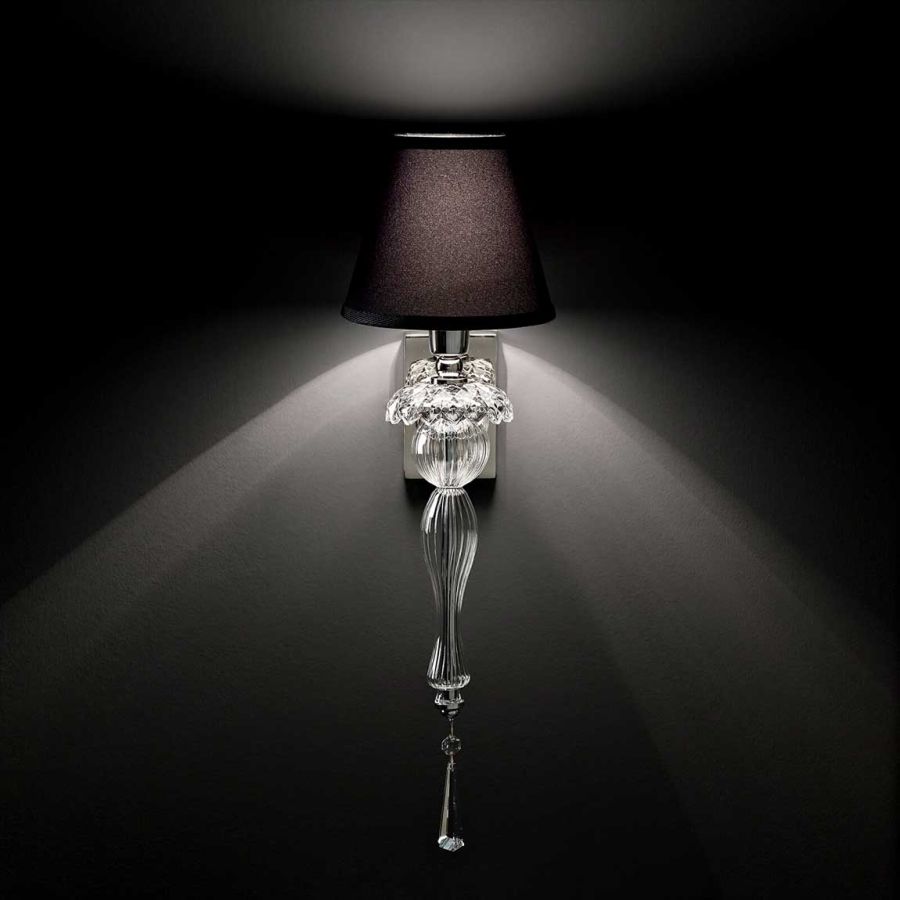 Wall lamp in carved crystal and glass, metal with nickel finish, black fabric shade and Swarovski elements pendants.