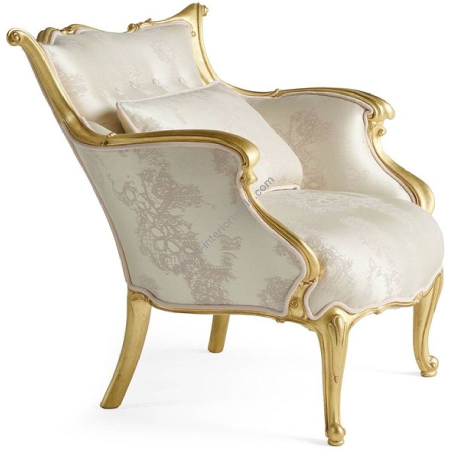 Regency is an elegant and comfortable armchair, whose name refers to the English style in vogue in the period that goes from the last years of the eighteenth century to around 1840 and which is characterized by the use of shapes and motifs that refer to the ancient world and to the Orient. The armchair features a hand-carved structure with a gold leaf finish and a delicate fabric upholstery.