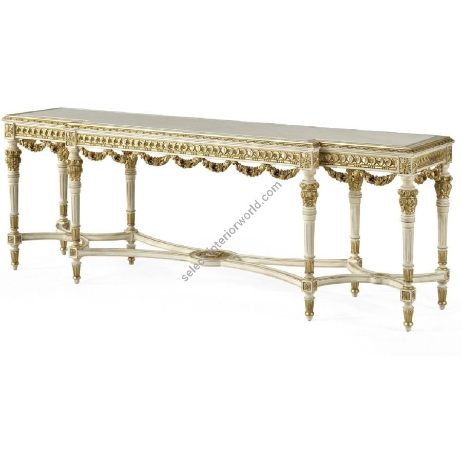 An emblem of artisanal excellence, the Guirlande console enchants with its rich garlands and slender columns, highlighted by luminous gold accents. The console rests on eight carved legs connected by a cross structure, finished in patinated white lacquer. The top in marble completes the piece, offering a harmonious blend of classical inspiration and eclectic aesthetic.