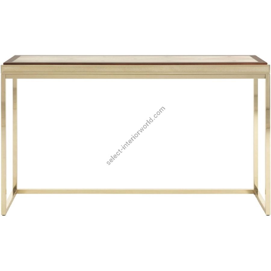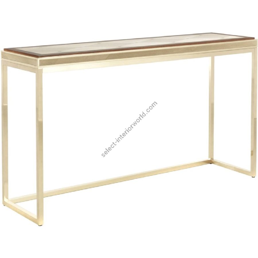 In the Hudson console, the light, slim and elegant design dialogues with the presence of precious materials and refined workmanship. An original aesthetic, with a timeless classic style, which is expressed in the combination of the glossy brass structure with engraved frame and the walnut top with natural maple and brass inserts.