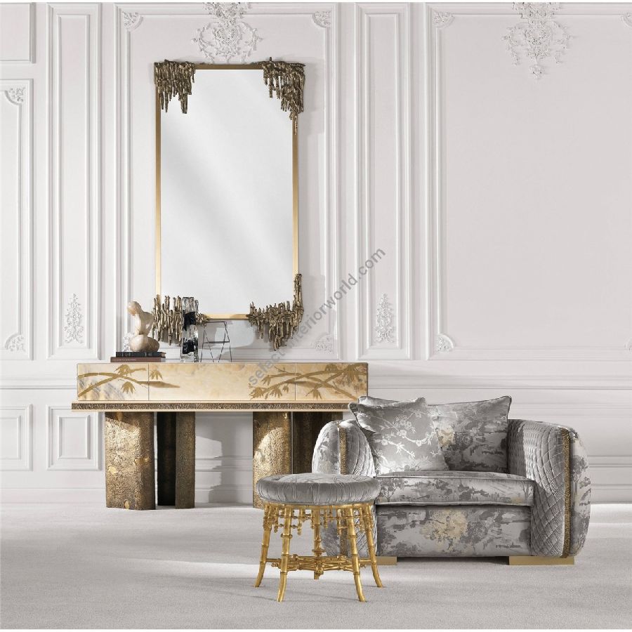 Characterized by sculptural shapes, the pieces of furniture of the Shinto line combine the essence of classic style with a contemporary allure. The pieces are distinguished by an original combination of materials, including natural maple, precious marble and brass casting. The parts in brass castings, with their materic appeal, contrast with shiny components in onyx or marble, enriched with refined decorations in gold leaf. All the pieces are characterized by an important artisanal component: the manufacturing mixes the use of experimental techniques with traditional methods handed down for centuries.