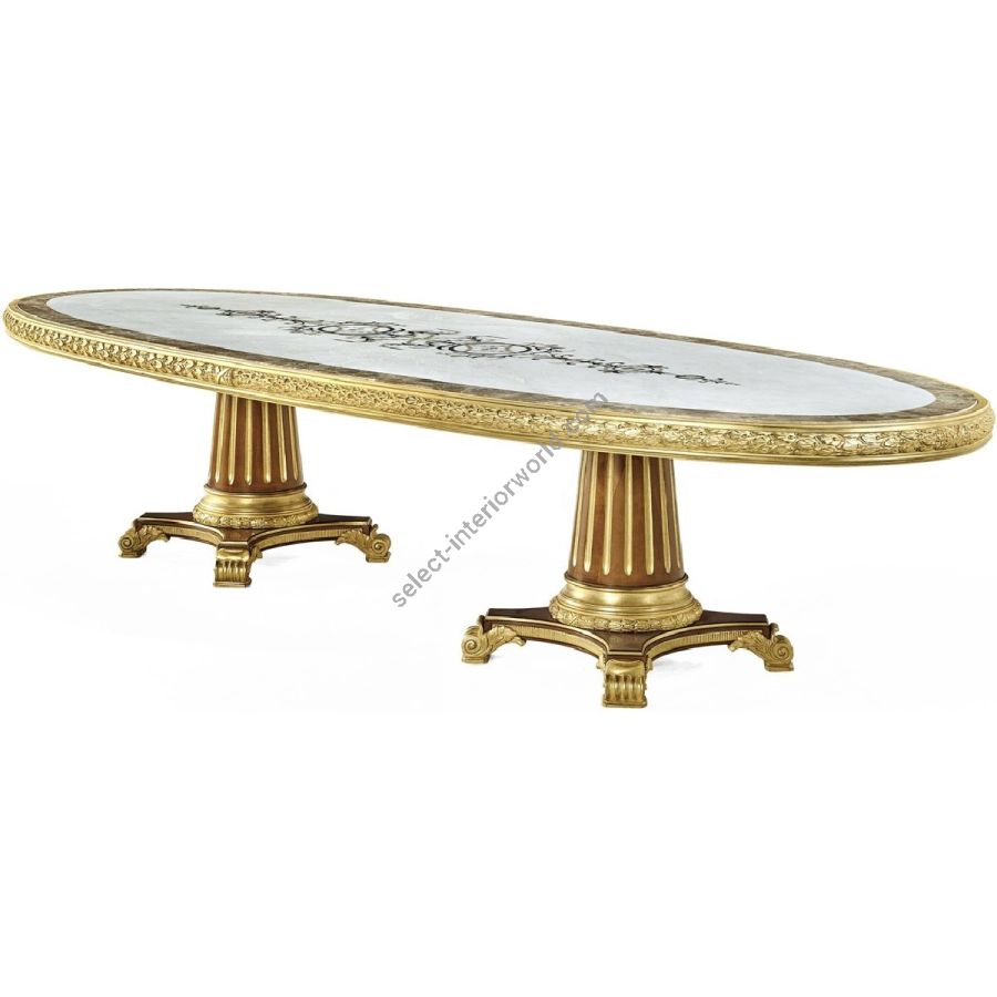 A statement piece of timeless grandeur, the Apollon dining table combines neoclassical elegance with refined craftsmanship. Its sculptural oval silhouette is crowned by a precious marble top, enhanced by inlays and wood trim that highlight its detailing. The base features majestic columns, richly carved and adorned with hand-applied gold leaf accents. The warm walnut and gold finish, along with the intricately sculpted wooden edge, add prestige to a table designed to elevate any formal dining space with distinction.