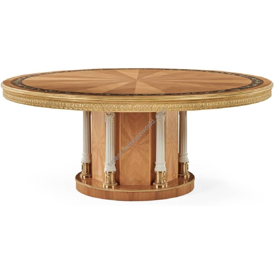Majestic and refined, Floral dining table features a base veneered in Tanganika with intricate brass inlays and neoclassical wooden columns with a white lacquer finish and cast brass details. The ray-of-sunshine top is adorned with a walnut inlaid border and hand-painted decorations. Precious, sophisticated and meticulously crafted in every detail, Floral is designed to become the showpiece in any dining room.