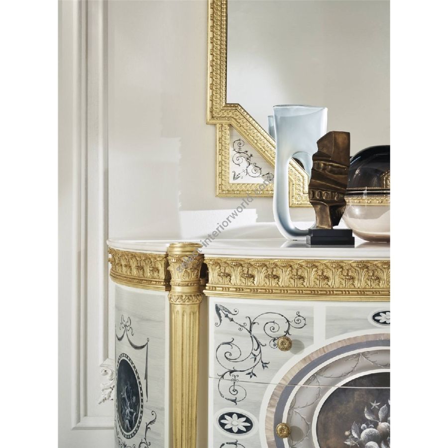 The Boulevard line expresses all the splendor of the classic French style and is characterized by precious carvings with gold leaf. The new furnishing element of the line, the chest of drawers, is presented with a new finish that has a special hand-crafted decoration as its star feature. The top of the piece of furniture is in light Namibia marble, a material that further enhances its precious charm.