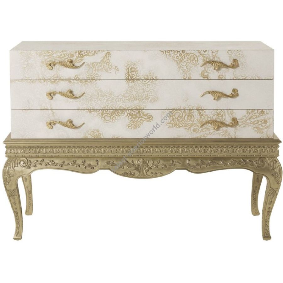 The pieces of the Brocart line showcase a refined style that evokes the luxury of the 17th and 18th century French noble courts. They present a base with hand-carved legs and antique gold-leaf finishes in pure classic style, combined with an upper part featuring a more essential and linear volume. The ornamental theme evokes the Cant lace, a motif of the Italian manufacturing tradition, present in the Cant territory since the XVIIth century, and is achieved through a special laser processing that allows carving of the top layer of lacquer to create the design.