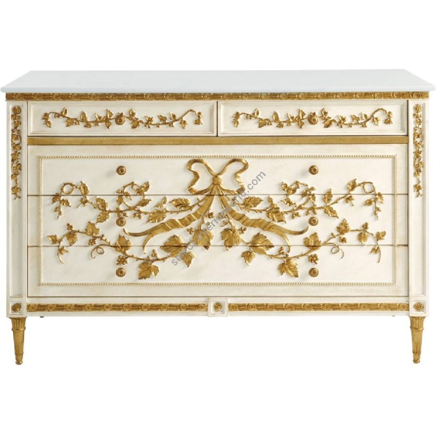 A refined and elegant classic French style for the Rubanier drawer unit. The piece of furniture is characterized by a patinated white lacquered wooden structure, enriched by decorative elements of Renaissance inspiration, hand carved and finished in gold leaf. The Namibia Rhino marble top completes the whole with a precious and luminous touch.
