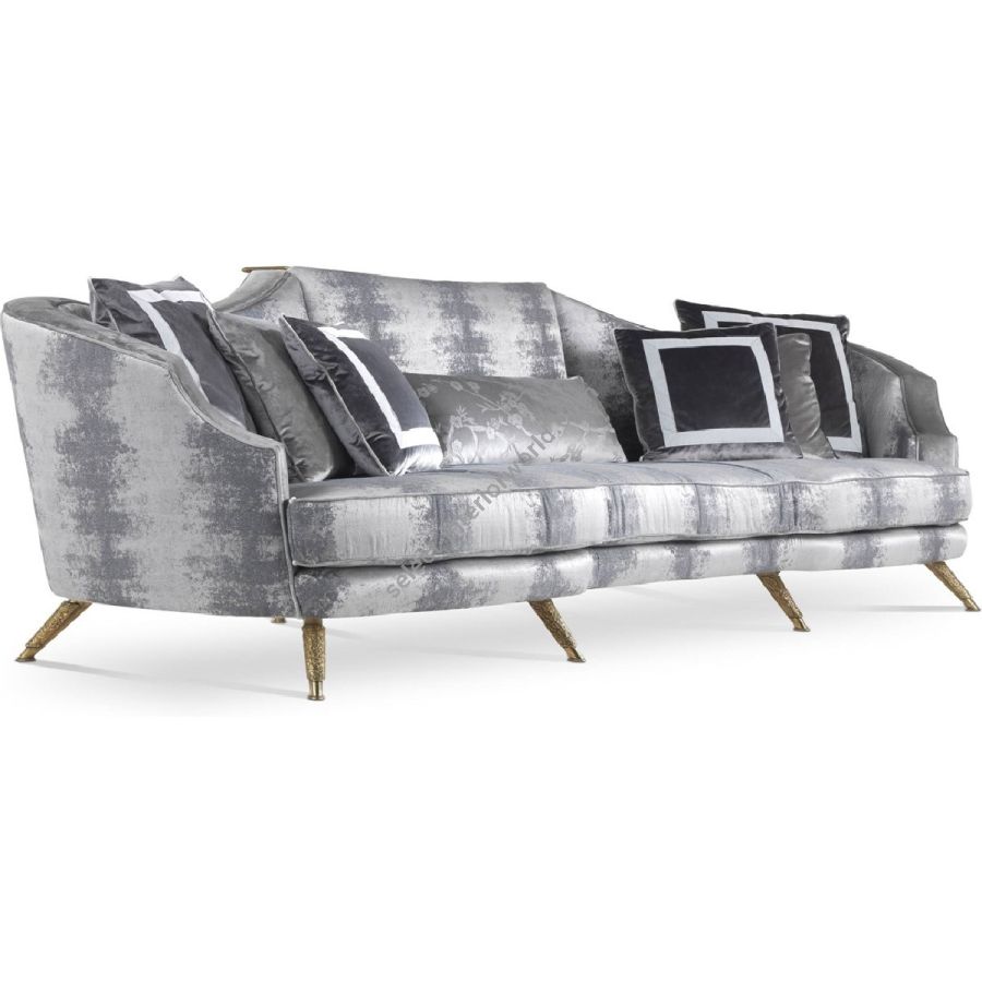 Available in different seating versions, the Shogun line is the main feature of extraordinary living rooms. Its eclectic charm results from a harmonious coexistence between the classic beauty expressed in the processing of the iridescent gray fabric covering and the modern lines present in the shape of the backrest and in the feet in decorated brass fusion.