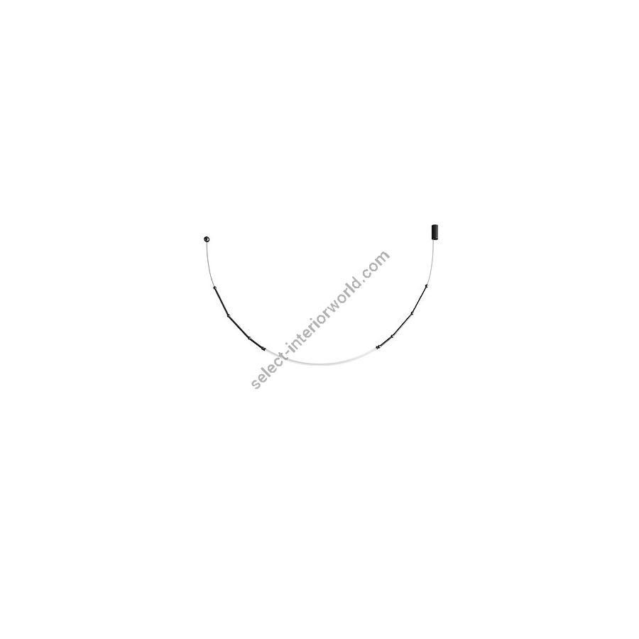 The lamps in this collection alternate between cylindrical bars and small spheres of anodized bronze or black aluminum, arranged like pearls in a ring on a wire supporting LEDs encased in a transparent, flexible silicone tube.