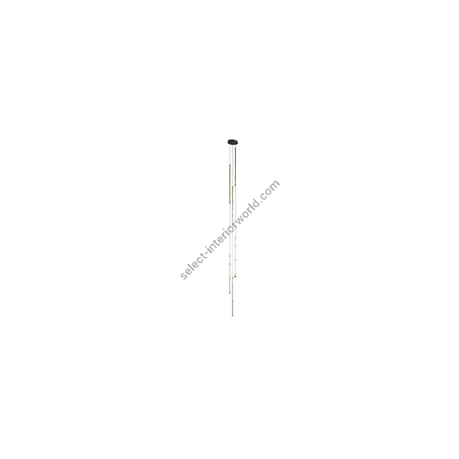 The lamps in this collection alternate between cylindrical bars and small spheres of anodized bronze or black aluminum, arranged like pearls in a ring on a wire supporting LEDs encased in a transparent, flexible silicone tube.