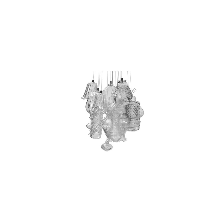 Like a chorus of bells or a bouquet of spring flowers, Ceraunavolta mixes 12 different lampshades, each with its own special treatment and decoration. These lampshades are made of transparent or polished blue Tiffany glass, using the original molds from the 1970s.