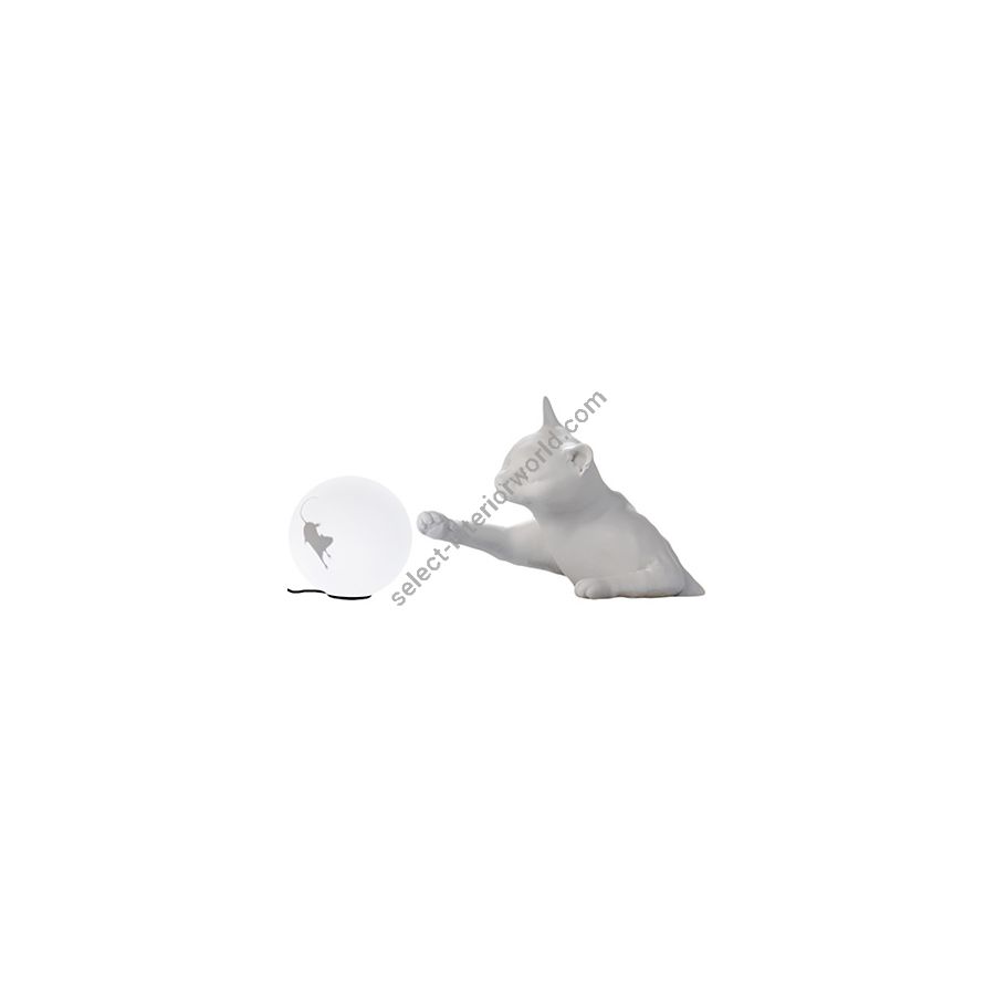 The cat appears to jump out of the wall or from the table, and playfully tease the mouse with its paws inside the luminous sphere. Composed of two elements, a cat body made of matt white ceramic and charcoal black ceramic a glass sphere with mouse-shaped inner sticker, MAOO can be hung on a wall or placed on a desk, bedside table, or table top. MAOO joins Karman Zoo, the famous collection of ceramic lamps designed by Matteo Ugolini and inspired by the animal world.