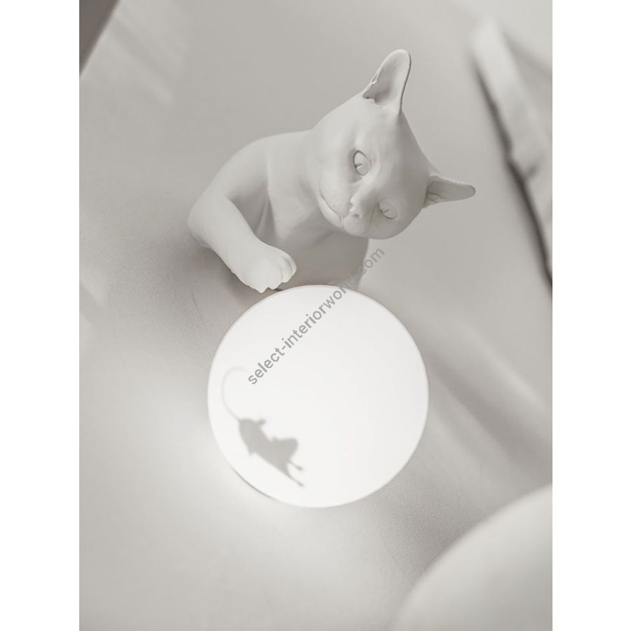 The cat appears to jump out of the wall or from the table, and playfully tease the mouse with its paws inside the luminous sphere. Composed of two elements, a cat body made of matt white ceramic and charcoal black ceramic a glass sphere with mouse-shaped inner sticker, MAOO can be hung on a wall or placed on a desk, bedside table, or table top. MAOO joins Karman Zoo, the famous collection of ceramic lamps designed by Matteo Ugolini and inspired by the animal world.