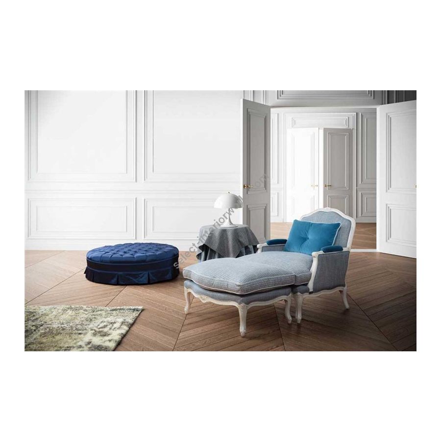 Sofa with a partially removable cover. Beech frame with handmade finished parts. Not deformable polyuretahne padding with different densities. Seat and backcushion with down filling. Different finishing on request with extracharge.