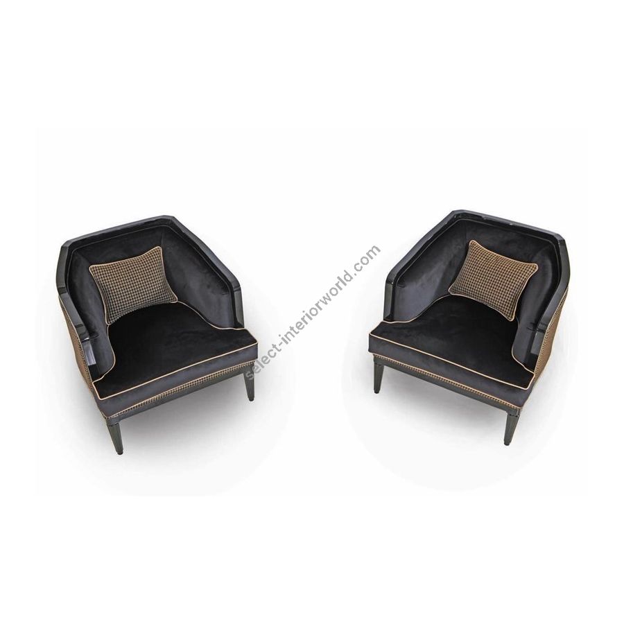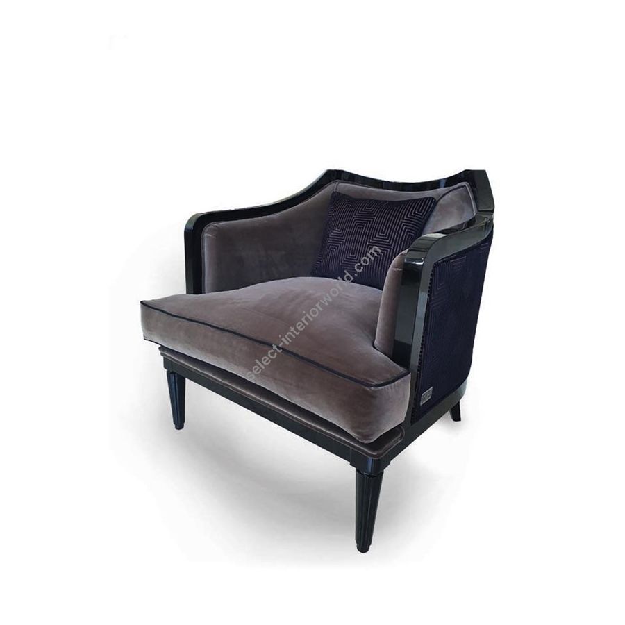 Armchair with fir wooden structure made of hand-engraved and hand-scribed. A padding made from non-deformable polyurethane foam. A decorative cushion padded with goose feather. Seat cushion in goose feather and spring with reversible super soft system. Finishing with gold or silver leaf on request with additional price according a price list. For a quilting on the external backrest, please consider the increase according a price list.