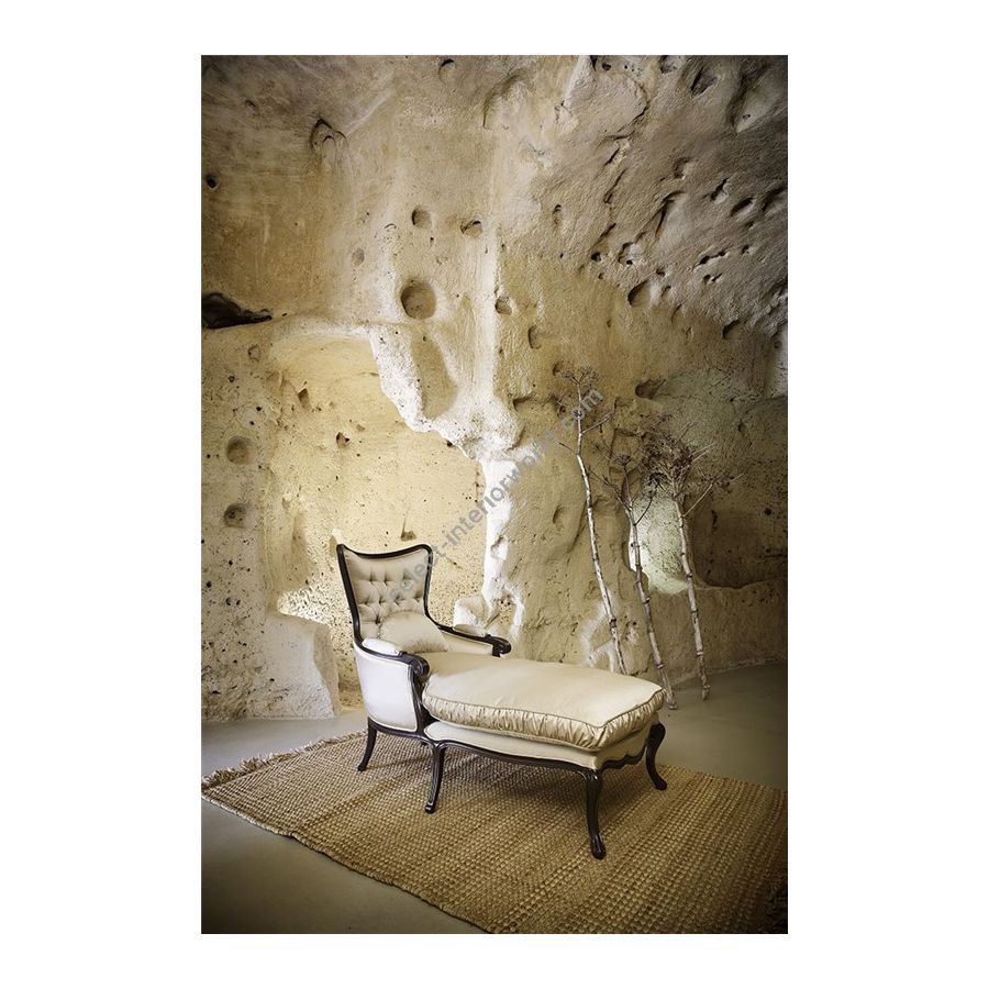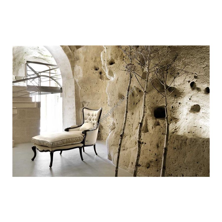 Armchair with partially removable covering, structure in beech wood and hand-engraved. Padding in deformable polyurethane foam and sitting cushion padded with goose feather.. Capitonnè and leaf on wooden base consider the increase according a price list.