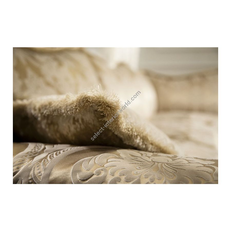 Sofa with a semiremovable seat covering. Fir wood and poplar multilayer structure. Non-deformable polyurethane foam upholstery with different densities. Reversible seat cuschions with down filling and SUPER-SOFT-SYSTEM springs. Armrest coverings, two upholstered side cuschions and beechwood feet. Upon request cuschions and backrests adorned with fringed ribbon. There is a bed version with one electro-welded standard support with H12 spring mattress.