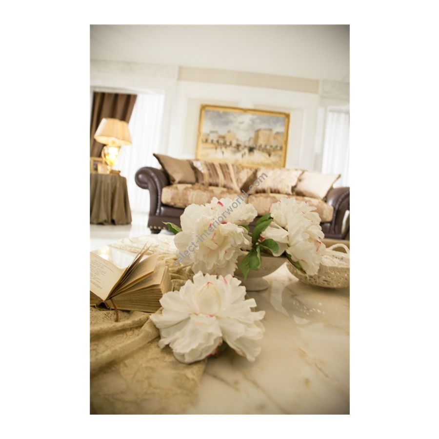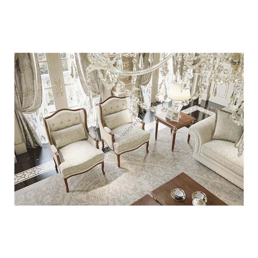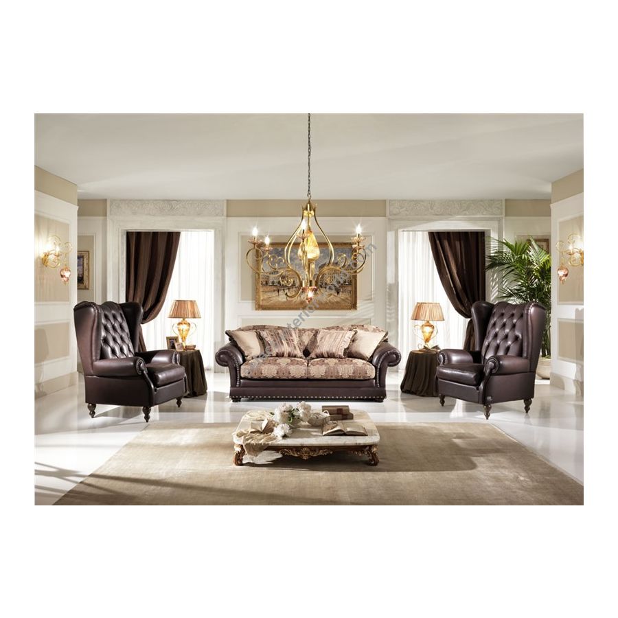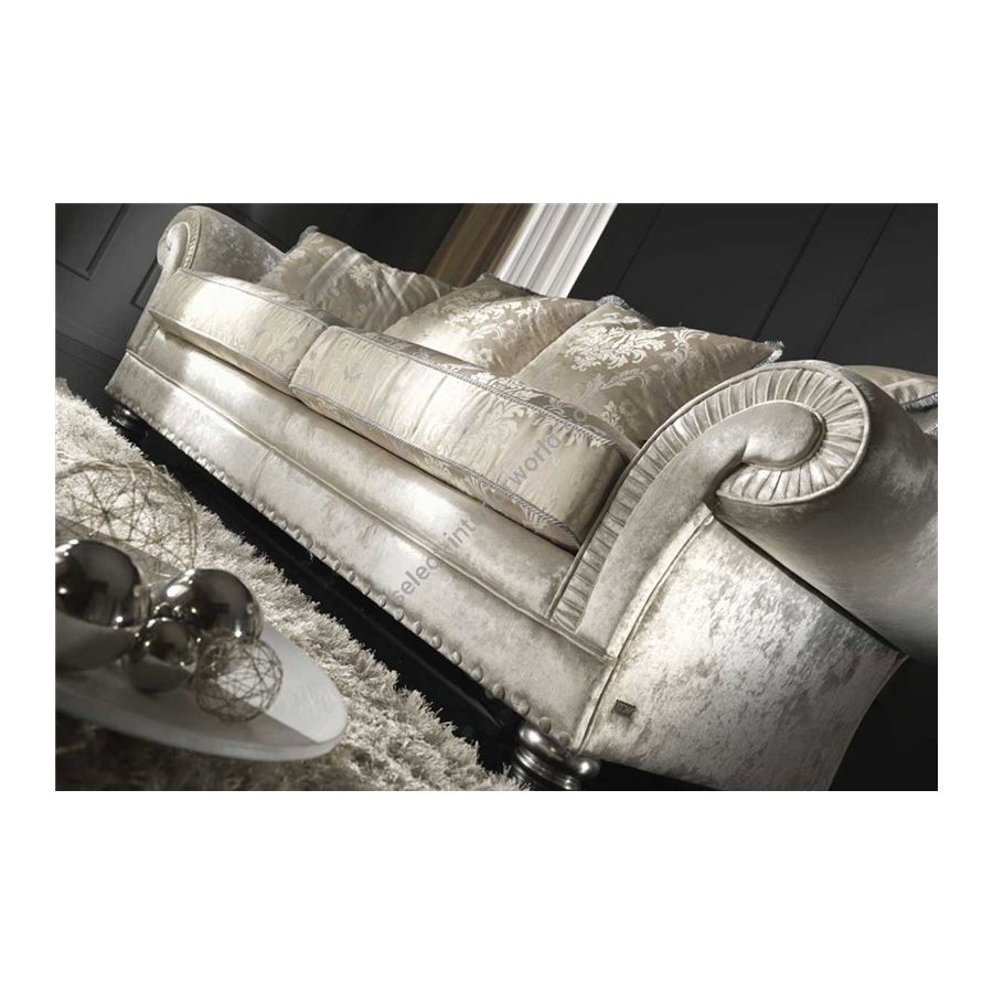 Its timeless classic line, its refined handmade details and elegant voluminous backrest, wide armrests and spirals in a fine plissé finish.