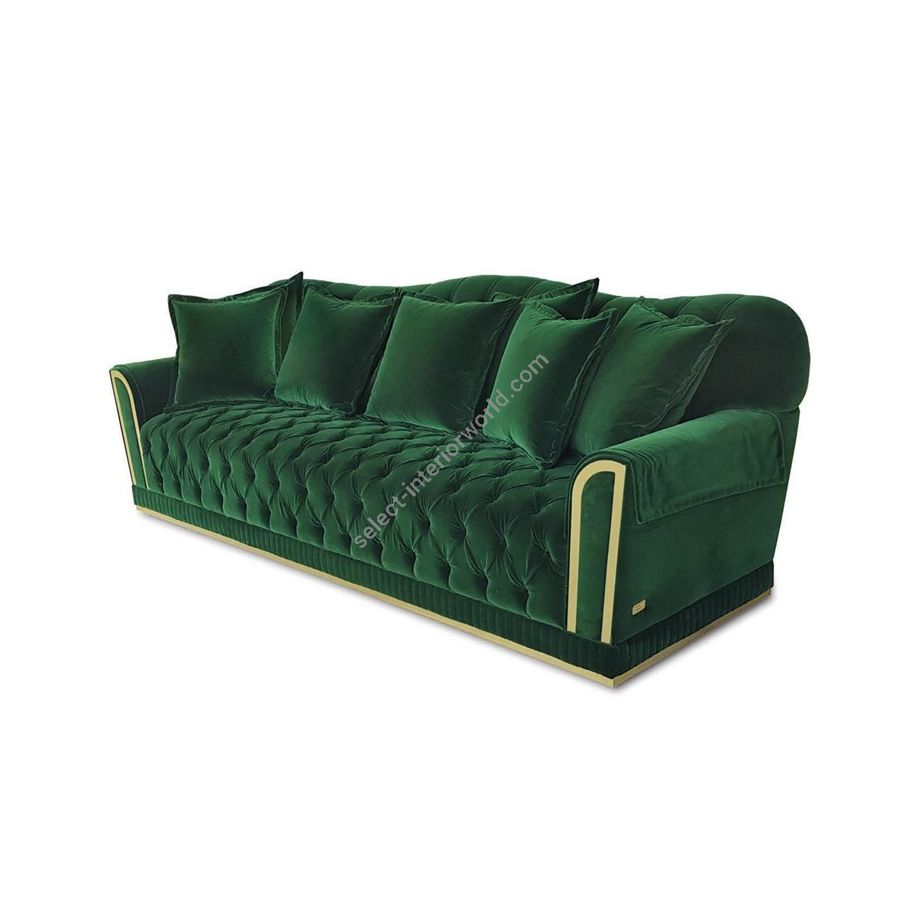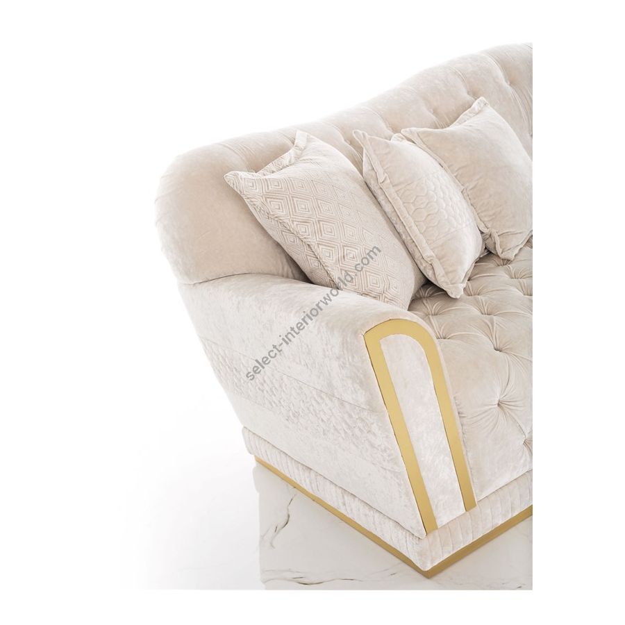Sofa with partially removable lining. Fir wood frame with poplar plywood and beech wood inserts. Non-deformable expanded polyurethane padding in different densities. Seat cushion with SOFT SYSTEM type springs of capitonné manufacture. Goose down back panels are standard equipment. The base and panel are brushed brass and varnished with a glossy finish. Quilting is available on the rear panel of the sofa and on the sides of the armrests with an extra charge.