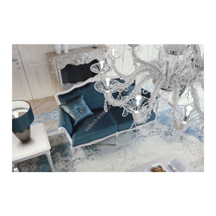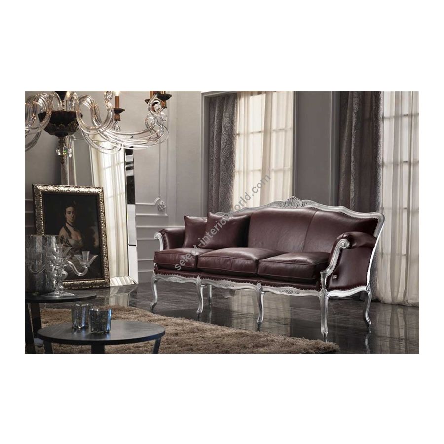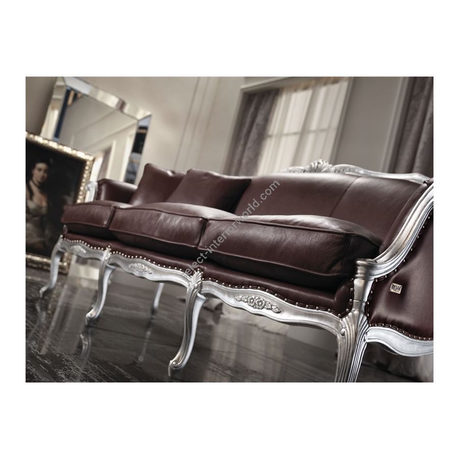 This is a partially covered sofa. The frame is made of beech wood with hand finished details. Polyurethane padding at differentiated quotas, down seat cushions, finished with a border matching the fabric, pleating on request, classic or brush cording. The side cushions filled with down with central strass are standard. Consider a surcharge as per the price-list for gold or silver leaf finishing.