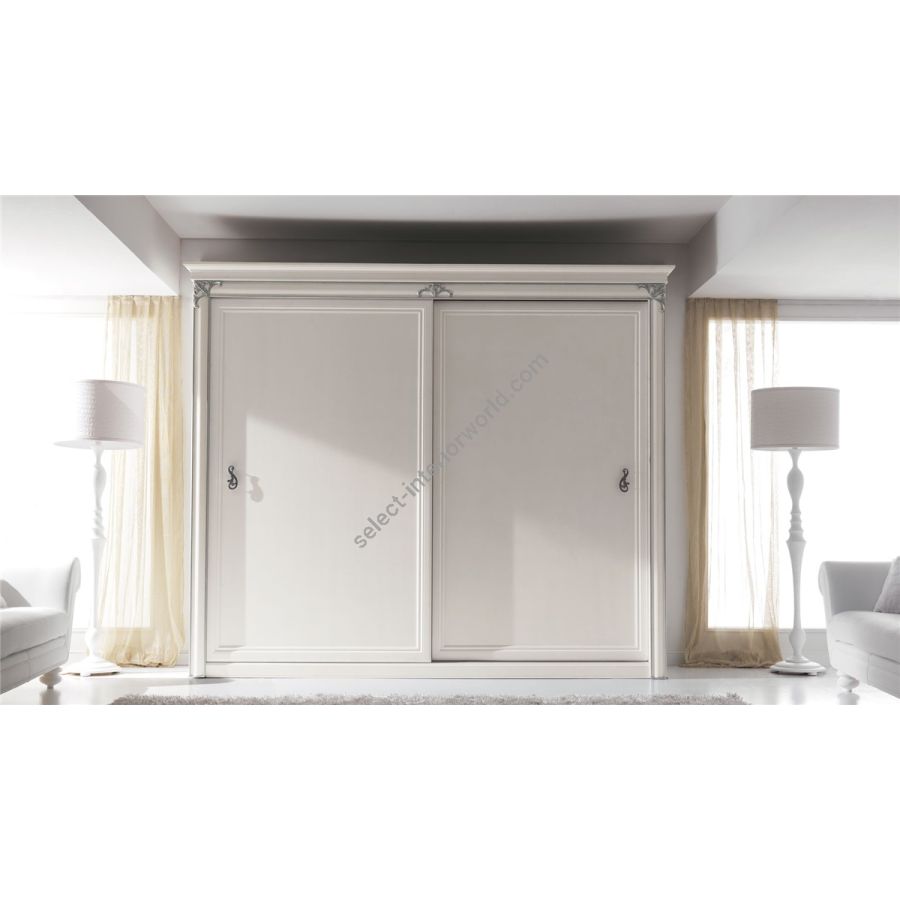 Wooden wardrobe with 2 sliding doors or 4 hinged doors with a classic line, with interior made of birch, frame with corner carvings and hat. The strong internal thicknesses, the noble materials and the craftsmanship make this wardrobe a piece of high artistic value. The different expressive possibilities made of monochromes and decorative contrasts to be created on the frame allow you to create unique compositions. Available with and without hat and with a wide choice of handles that can be combined with night groups, also in the version with two hinged doors.