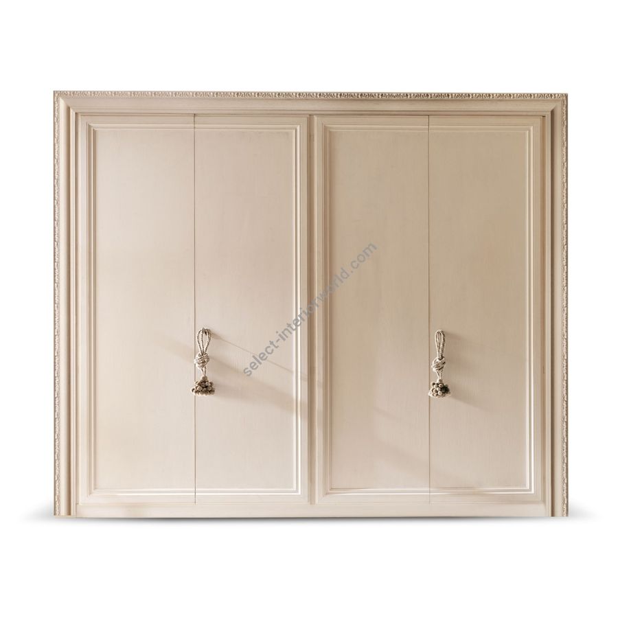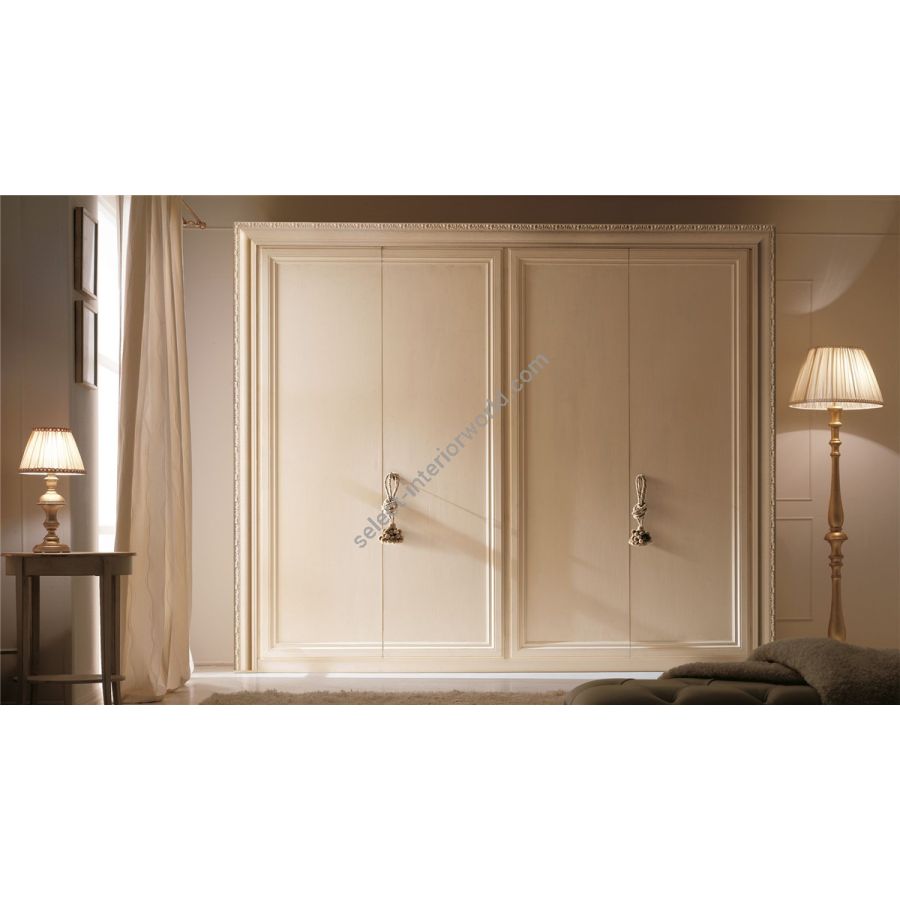 Armadio in legno con 4 ante battenti o 2 ante scorrevoli dalla linea classica, con interno realizzato in betulla, cornice con bordo intagliato. I forti spessori interni, i materiali nobili e la lavorazione aritigianale rendono questo armadio un pezzo di alto valore artistico ed estetico. Le diverse possibilità espressive fatte di monocromie e contrasti decorativi da realizzare sulla cornice consentono di creare composizioni uniche. Disponibile con una ampia scelta di maniglie abbinabile ai gruppi notte, anche nella versione a due ante battente.