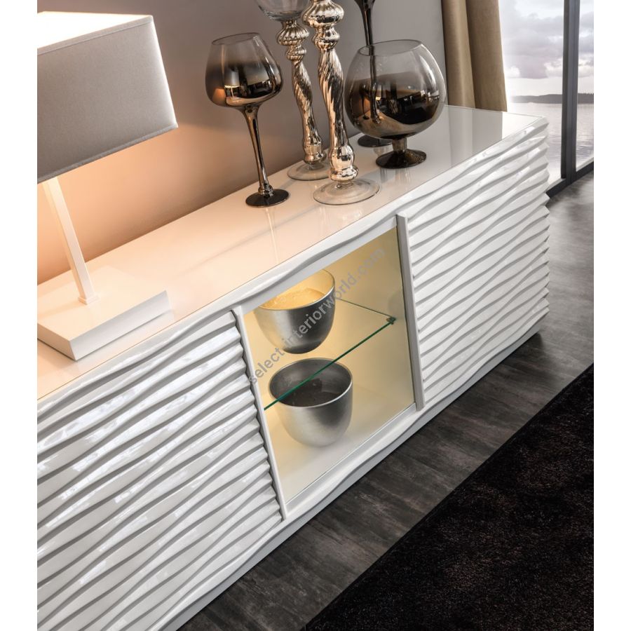 Modern-contemporary chest of drawers and bedside table, realized with a precious wooden carved wavy design and built-in glass top. Ebon is an isolated atoll in the Ocean, scattered of waved sandy shores, like the surface of this collection: a perfect balance of technique and beauty. Pure shapes, perfect lines, model “items” usefull for our daily life, but also necessary to make our life beautiful. The sideboard with two closed doors and central glass door has a top with shaped wooden edge and built-in glass.